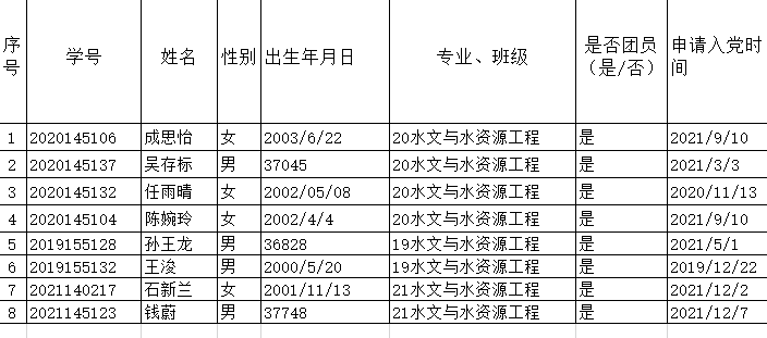 根据本人申请、组织培养,经中共宿州学院资源与土木工程学院党委水文类专业学生党支部委员会集体研究决定,拟将成思怡等8名同志列为入党积极分子,现将其有关情况予以公示。在公示5个工作日内,党员和群众可来电、来信、来访,实事求是地反映其在理想信念、思想作风、工作表现、廉洁自律等方面的情况和问题。