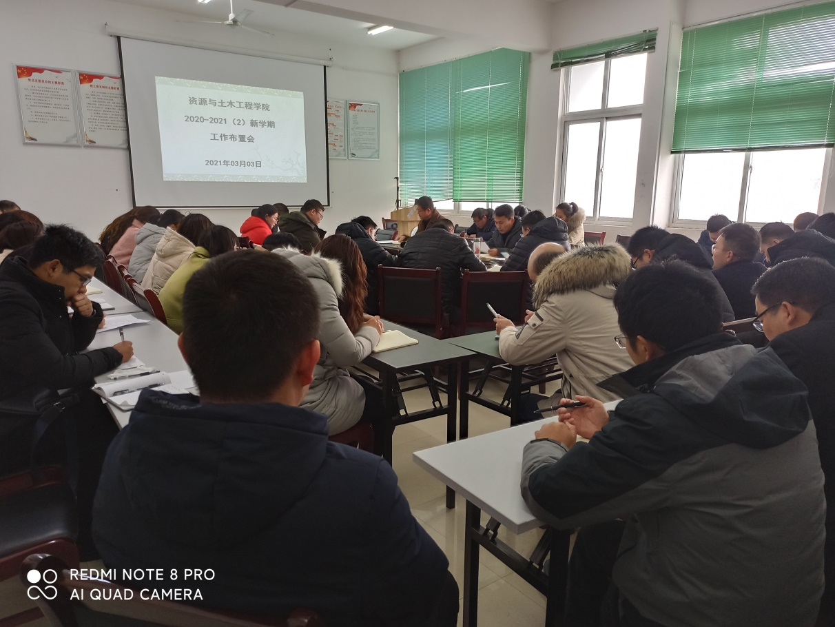2021年3月3日上午9时,资源与土木工程学院在工科楼院会议室314召开了新学期第一次教学工作会议,会议由陈松院长主持,资源学院书记张持堂及全体教师参加了本次会议。