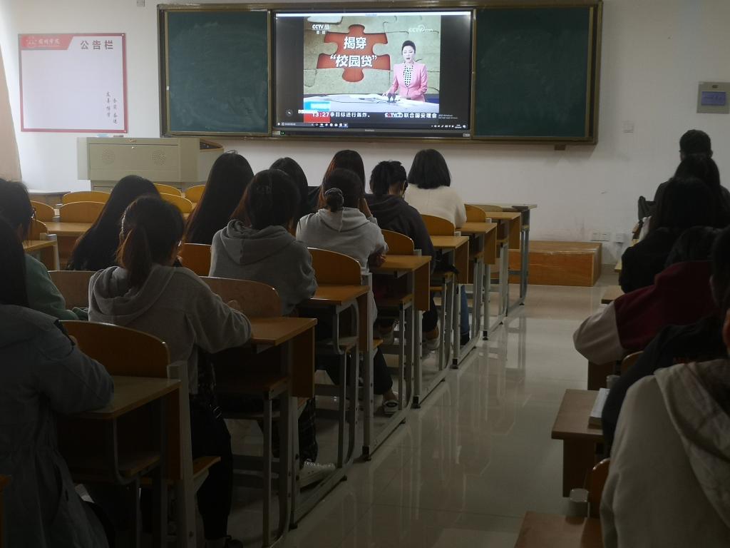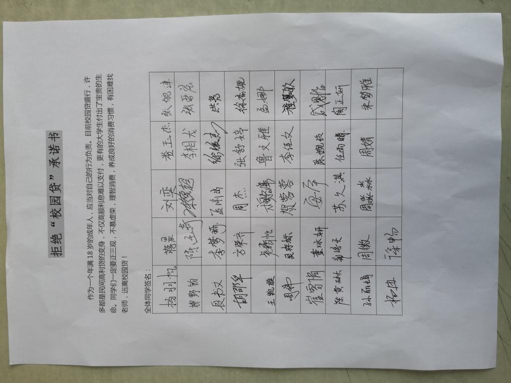 会上同学们一起观看了《揭穿“校园贷” 》视频,通过案例让同学们认识到网上贷款带给人们的危害,加强对网上贷款的警惕,不受网贷的困扰,拒绝网贷防止受骗。同时,同学们在拒绝校园贷承诺书上进行了签字,将关于整治校园贷的精神落实到每个学生身上。