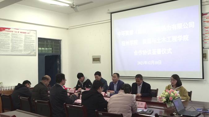 2021年12月10日下午,资源与土木工程学院与中环寰慧(宿州)节能热力有限公司“校企合作及实习实训就业基地”签约暨授牌仪式在宿州学院工A402会议室顺利举行。学院党委书记张持堂和副院长冯松宝及土木相关教师出席签字仪式。土木教研室牛智勇主持签字仪式。