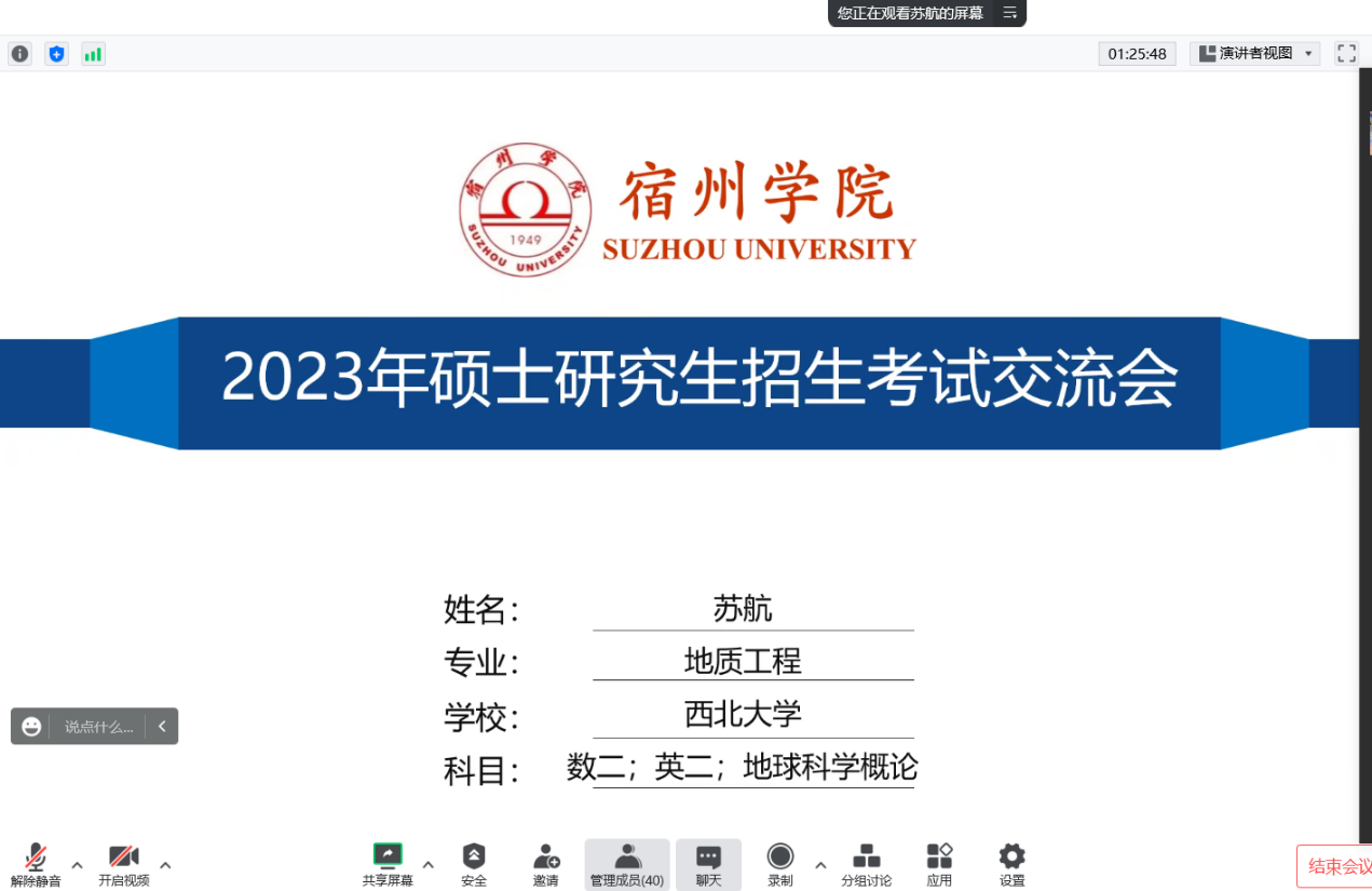 11月21日晚上7:00-9:00,资源与土木工程学院通过腾讯会议召开研究生招生考试交流会。特别邀请合肥工业大学(帅秋燕)、中国矿业大学(宋博文)、中国矿业大学(北京)(何帅,杨玉刚)、河海大学(洪申申,徐阿猛)及西北大学(苏航)等8位同学分享个人考研经验。相关教师和同学共50余人参加本次活动。