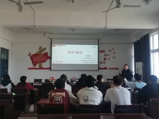 赵老师介绍了岩石和矿物的基本知识,从常见矿物的形态和物理性质、火成岩岩石标本鉴定、沉积岩岩石标本鉴定三个方面讲述了如何开展岩石矿物鉴定。2个小时的讲座同学们表示收获颇丰。讲座结束之后,赵老师与各位同学一起前往412标本室,现场观看矿物和岩石标本,练习岩矿的规范描述。