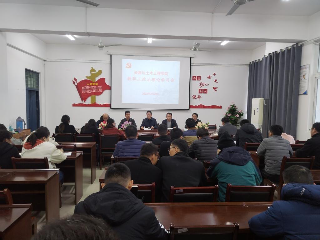 3月22日下午,资源与土木工程学院在工A402会议室召开教职工理论学习会,传达学习习近平总书记在全国两会期间的重要讲话和全国两会精神,并开展廉政警示教育。党委书记张持堂主持会议,全体教职工参加学习。