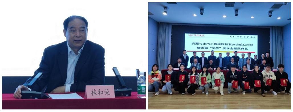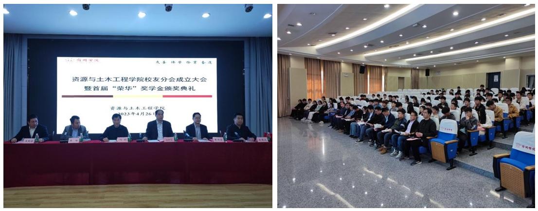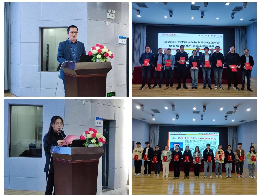 2023年4月26日下午,资源与土木工程学院校友分会成立大会暨首届“荣华”奖学金颁奖典礼在宿州学院招聘大厅隆重举行。地质工程专业学科带头人桂和荣教授,校友办公室主任、招就处处长杨刚,资土学院党委书记张持堂、院长陈松、党委副书记徐国庆、副院长王明梁出席大会。地质工程专业校友代表、首届“荣华”奖学金获得者以及2021、2022级部分同学参加大会,会议由陈松主持。