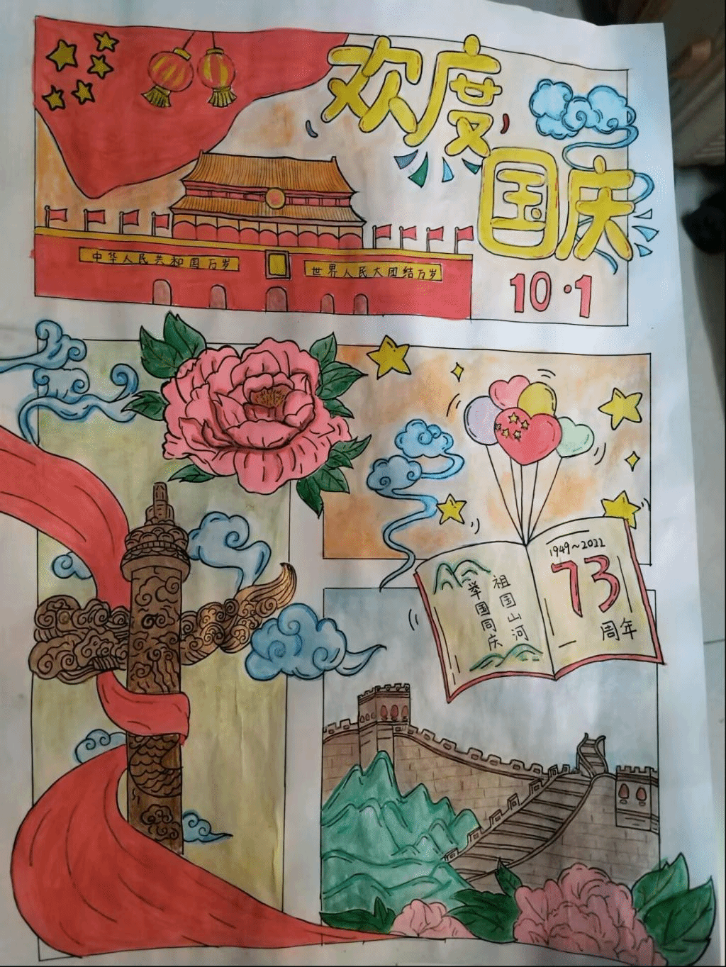 在比赛中,同学们认真发挥奇思妙想,根据“喜迎国庆”的主题,绘制了一系列的作品。同学们结合自身创意和独特构想,用笔尖为祖国献上祝福,以设计诠释中华民族伟大复兴的中国梦,展现出学子们的爱国情感和精神风貌。