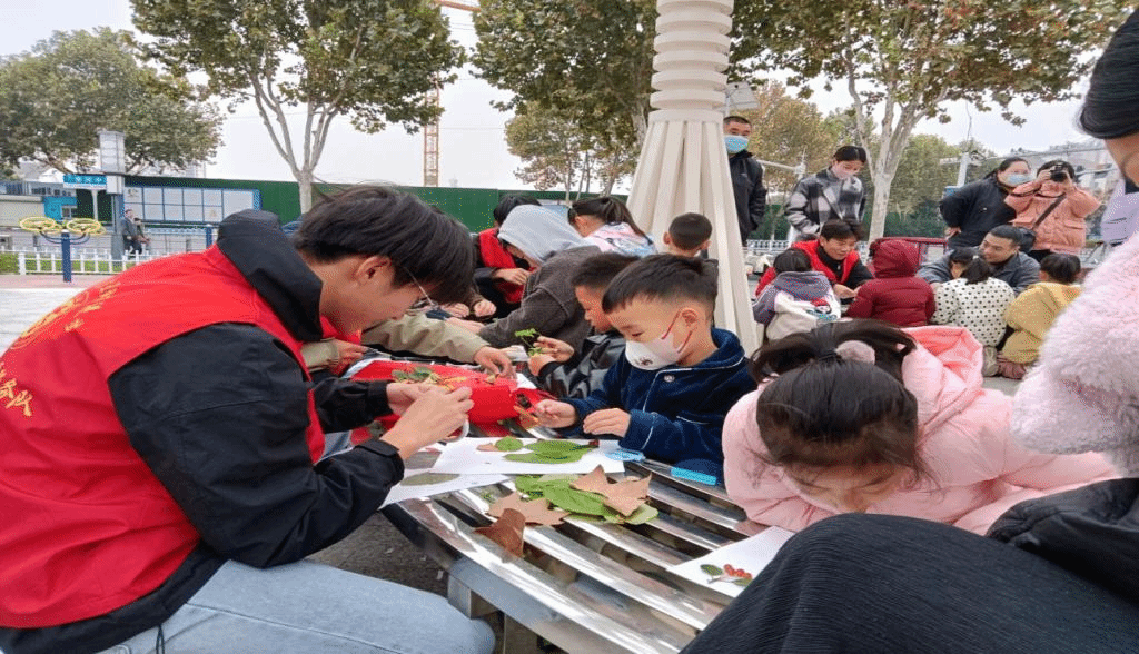 本次活动地点在观李社区,志愿者们在宿州学院北门集合完毕后,由社区工作人员开车接送到达活动地点。本次志愿活动中,志愿者们随着社区工作人员的引导来为小朋友讲解树叶画是什么并帮助小朋友进行树叶画创作。在树叶画创作过程中,志愿者们帮助小朋友裁剪树叶和将树叶粘贴到纸张上,并帮助小朋友们收集树叶,增加作品的丰富度和美感。在活动的最后我们与小朋友们和他们各自的作品进行了合影,并在小朋友们离开后与社区工作人员一起打扫卫生,保持环境的整洁。