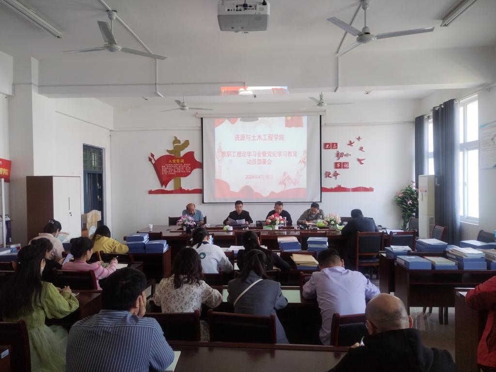 4月18日下午,资源与土木工程学院在工A402会议室召开教职工理论学习会,深入学习习近平总书记关于党纪学习教育重要讲话和重要指示批示精神,并就开展党纪学习教育作了动员部署。学院党委副书记、院长陈松主持会议,全体党政干部、教职工参加学习。