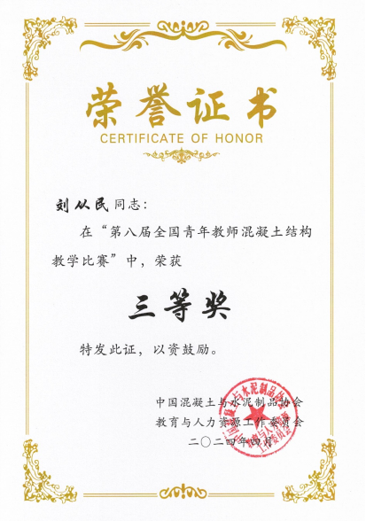2024年4月20日至21日,由中国土木工程学会教育工作委员会、教育部高等学校土木工程专业教学指导分委员会和中国混凝土与水泥制品协会教育与人力资源工作委员会主办,由合肥工业大学土木工程学院承办的第十八届全国混凝土结构教学研讨会暨第八届全国青年教师混凝土结构教学比赛在合肥工业大学举行。本次比赛吸引了哈尔滨工业大学、吉林大学、合肥工业大学、武汉大学等全国58所高校的75名青年教师参加,我院土木工程专业教师刘发明和刘从民参加了教学研讨会议,青年教师刘从民以“受弯构件正截面承载力分析”为授课主题进行了教学比赛,并荣获三等奖。