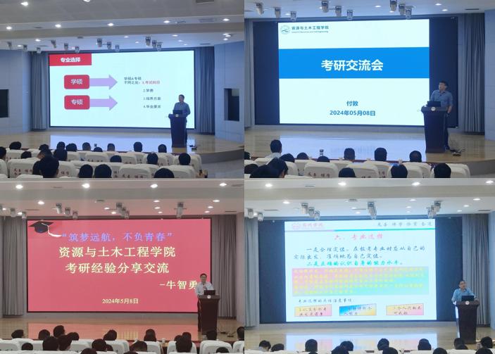 接着,地质工程教研室主任魏强博士、水文与水资源工程教研室主任付敦博士、土木工程教研室主任牛智勇博士、水文与水资源工程专业教师党支部书记张俊博士结合他们自身的求学经历,从自身考研、考博的实际经历谈院校、专业选择、报名、初复试及院校调剂等几个方面为同学们详细地介绍考研整个流程,使同学们对考研的流程有了全面的了解。四位老师均建议同学们要明确方向,制定科学的复习计划,要立长志,要能吃苦、有耐心、有恒心、能坚持,同时要学会释放压力,学会分享,切勿攀比。