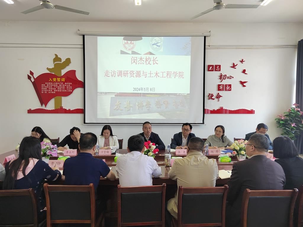 5月8日上午,党委副书记、院长闵杰前往资源与土木工程学院进行走访调研。办公室主任岳尧、发展规划处处长方雪梅、人事处副处长赵丹、教务处副处长唐永刚、科技处副处长毛强等陪同调研,资源与土木工程学院科级以上干部参加座谈。