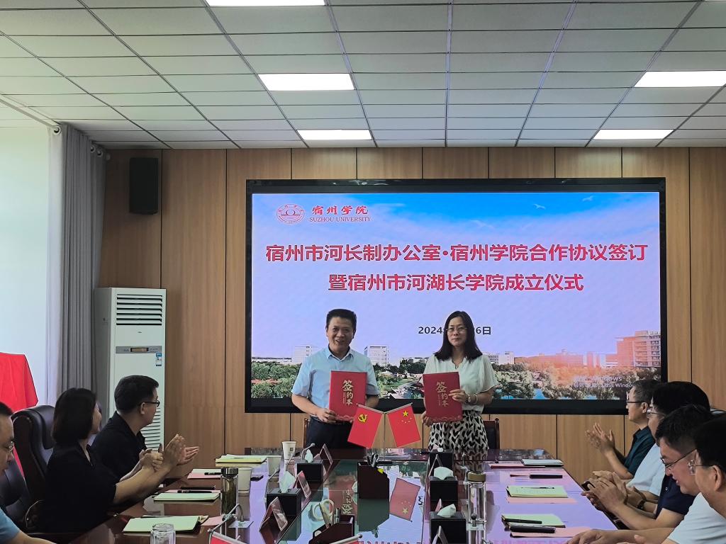 孙洲与资源与土木工程学院院长方雪梅共同签署了合作协议。杨维志、任国燕与孙洲共同为宿州市河湖长学院揭牌。