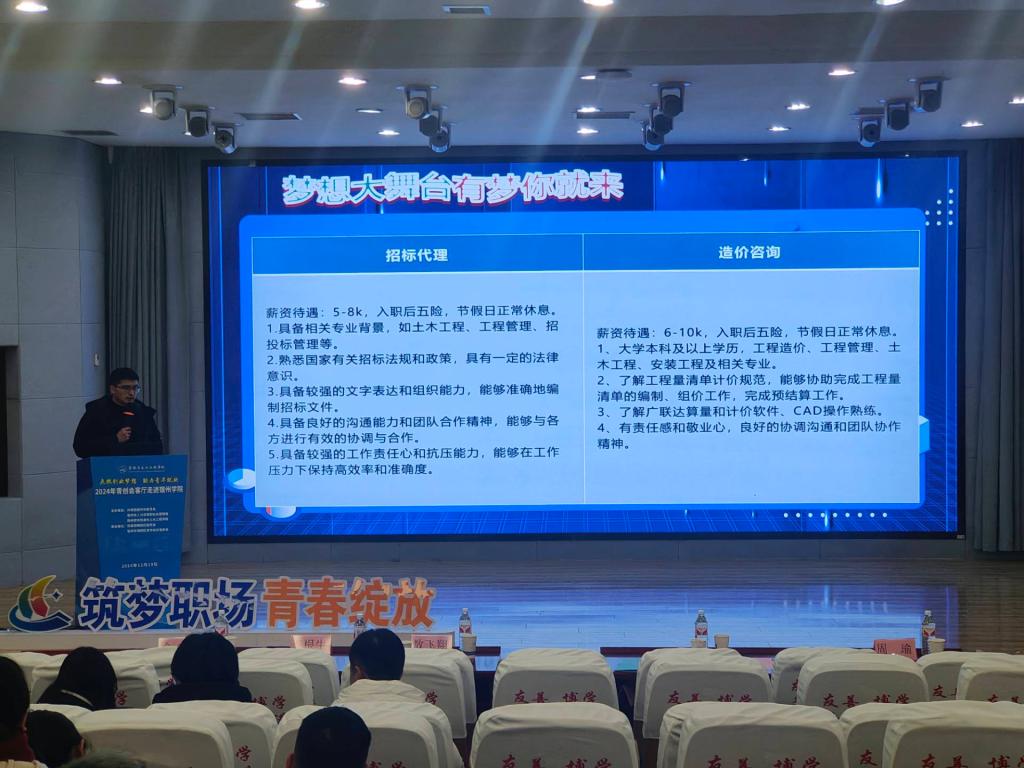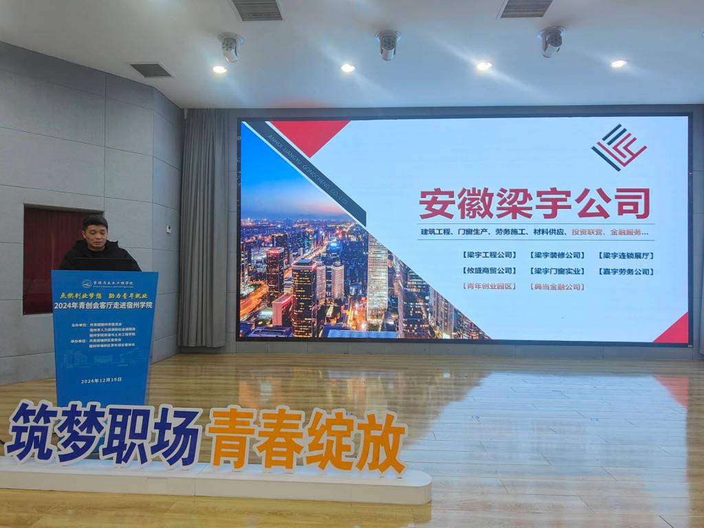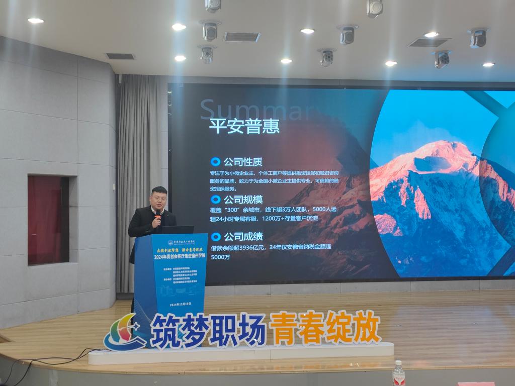 当天下午,招聘大厅内人头攒动,气氛热烈会场内,人头攒动,气氛热烈。平安普惠、尚层尚品、安徽忠之盈工程咨询公司、北京京卫宏远集团、安徽梁宇公司、安徽万硕科技产业有限公司、安徽锦耕置地有限公司齐聚一堂,这些企业来自各行各业,包括高新技术产业、建筑工程业、金融服务等领域,带来了丰富多样的就业岗位,如技术研发、建筑设计、市场营销、行政管理等,满足了不同专业、不同层次毕业生的求职需求。参会企业不仅有本地的优质企业,还有一些外地企业,为毕业生们提供了广阔的就业空间和发展平台。此外,安徽隐宿文化旅游公司的王子豪,安徽梁宇工程有限责任公司的蒋中梁分享了自己的创业故事,为毕业生提供了丰富经验。