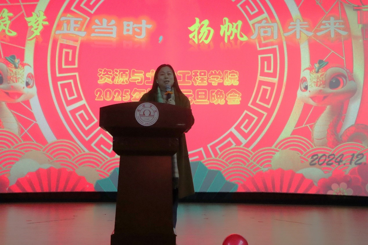 晚会现场布置得温馨而热烈,彩色的气球、闪烁的灯光交相辉映,充满了节日的喜庆氛围。晚会在活力四射的开场舞中拉开帷幕,舞者们用灵动的舞姿瞬间点燃了现场气氛,随后资源与土木工程学院院长方雪梅向到会同学们介绍了学院师资队伍、实习实训平台、考研就业、学科竞赛等情况,对同学们给予期许,希望他们在大学实现自己的价值,明确努力的目标。