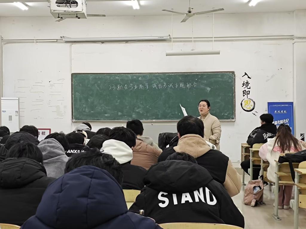 各班辅导员分别对期末考试进行要求,希望同学们期末好好复习,诚信考试、拒绝作弊。并带领同学们学习《宿州学院学生违反考试纪律处理办法》,再次强调考试作弊的危害性,引导学生自觉严格考试行为,禁止违纪作弊行为。