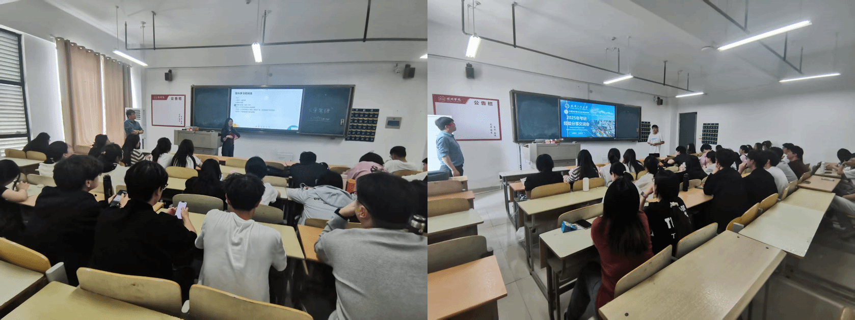 在经验分享环节,成功考入长江大学的龚焕同学从时间管理、科目复习策略入手,强调“基础扎实+真题反复训练”的关键性;上岸武汉工程大学的周广正同学则分享了跨考备考技巧和调剂经验,提醒学弟学妹“信息战”的重要性;此外,高分考入河海大学的安宇同学针对政治、英语等公共课的提分方法进行了细致讲解,并分享了近一年来的读研感受。
