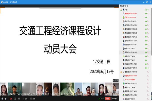 为进一步落实本次课程设计过程管理,2020年6月29日晚,我院17级交通工程专业在网上利用网络视频召开了交通工程经济课程设计动员大会。我院教师卢莹及17级交通工程专业全体学生参加了此次动员大会。