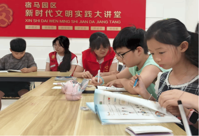 “共青团是党的助手和后备军,党章团章就像我们成长的指南针!”在宿马园区新时代文明实践中心内,志愿者以生动有趣的方式为留守儿童讲解团章、党章的由来与内涵。通过历史故事、互动问答和动画短片,孩子们不仅了解了“少先队—共青团—共产党”的成长路径,更被革命先辈的奋斗精神深深感染。一名孩子兴奋地说:“我长大后也要当共青团员,帮助更多的人!”志愿者还分享了当代青年的励志事迹,鼓励孩子们树立远大理想,传递积极向上的正能量。