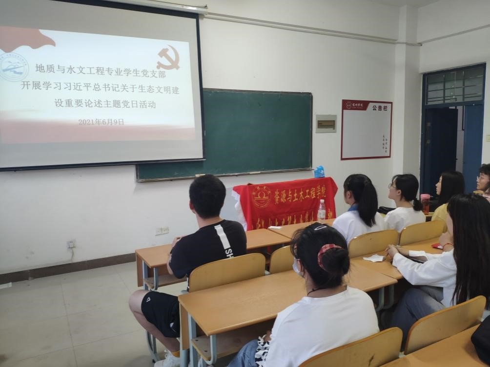 2021年6月9日,为加强支部全体成员对于“绿水青山就是金山银山”的理解,推进校园文明生态建设创新,地质与水文工程专业学生党支部全体成员于工科楼A605学习有关“习近平总书记对于生态文明建设重要论述”主题党日活动。