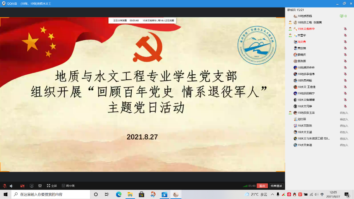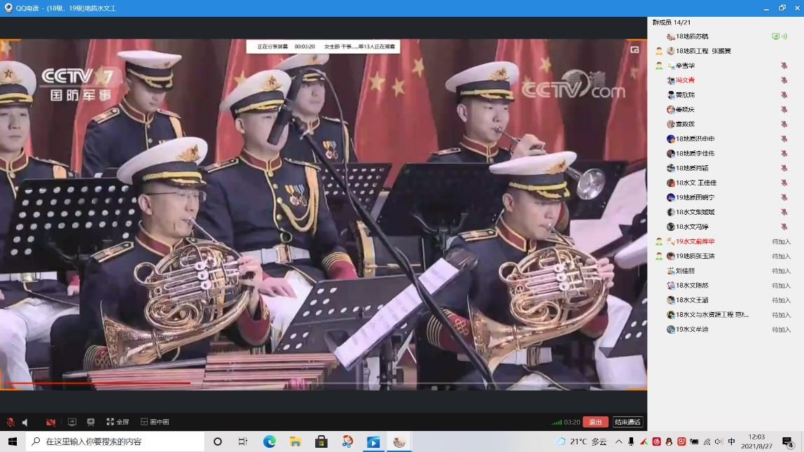 8月27日,地质与水文工程专业学生党支部全体成员,组织开展“回顾百年党史 情系退役军人”主题活动,一同重温“中国人民解放军军乐团英雄赞歌庆祝中国人民解放军建军93周年八一专场音乐会”。