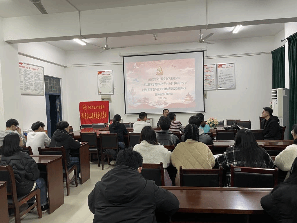 2021年12月8日,资源与土木工程学院地质与水文工程专业学生党支部在工科楼四楼会议室开展以“认真学习贯彻习近平关于《中共中央关于党的百年奋斗重大成就和历史经验的决议》的讲话”为主题的理论学习会。学习会由支部书记赵景宇组织开展,支部全体同志参与。