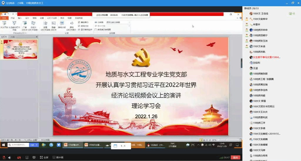 2022年1月26日,地质与水文工程专业学生党支部通过线上的方式开展以“习近平在2022年世界经济论坛视频会议上的演讲”为主题的理论学习会。学习会由支部书记赵景宇组织开展,支部全体同志参与。