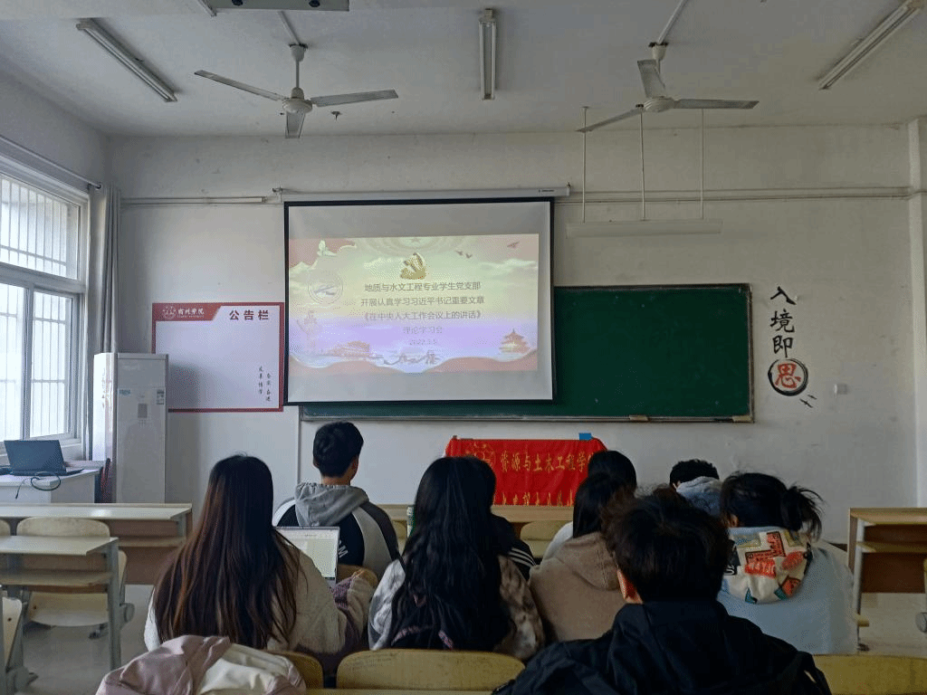 2022年3月5日,地质与水文工程专业学生党支部在工科楼A106开展认真学习习近平总书记重要文章《在中央人大工作会议上的讲话》理论学习会,会议由支部书记赵景宇组织开展,支部全体同志参与。