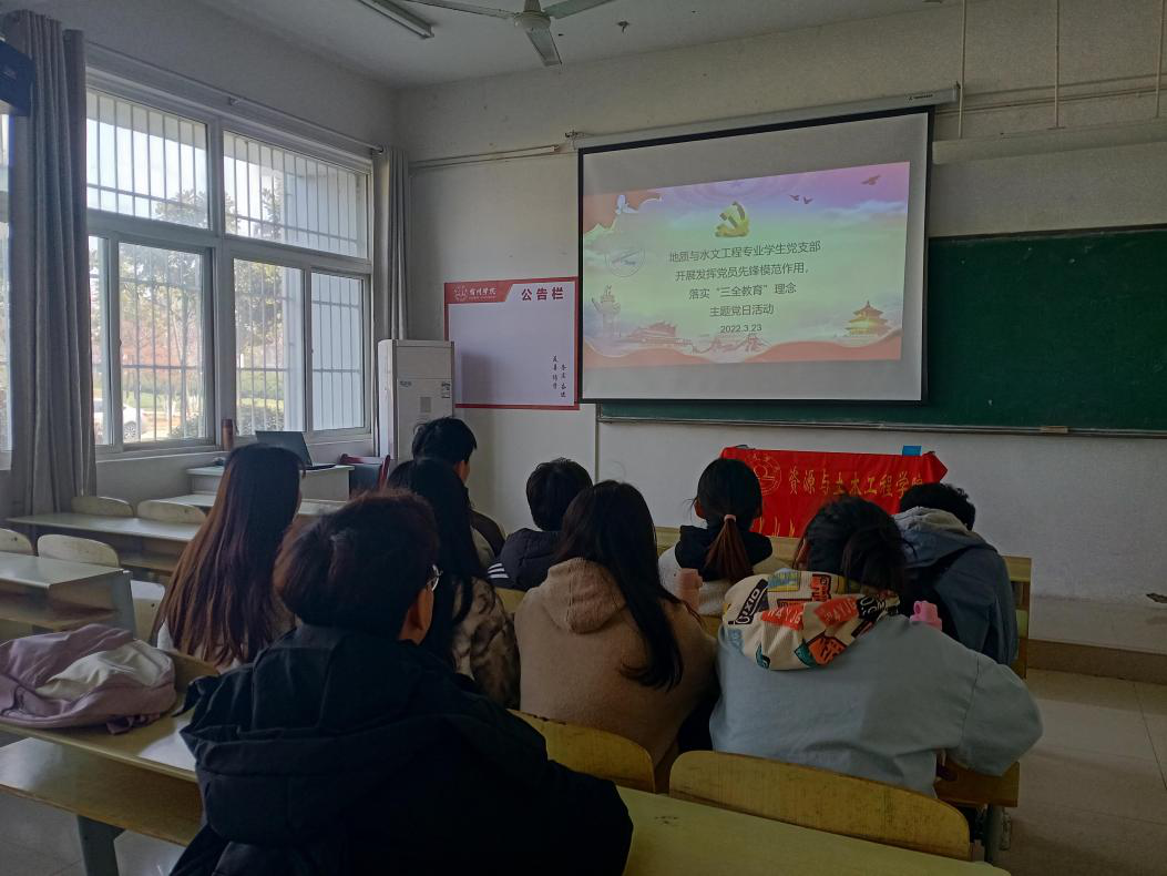 为深入学习贯彻习近平新时代中国特色社会主义思想,进一步推进“全员育人、全过程育人、全方位育人”理念实施,2022年3月23日,地质与水文工程专业学生党支部全体成员,一同在工科楼A106开展“发挥党员先锋模范作用,落实‘三全教育’理念”主题党日活动。会议由赵景宇书记主持。