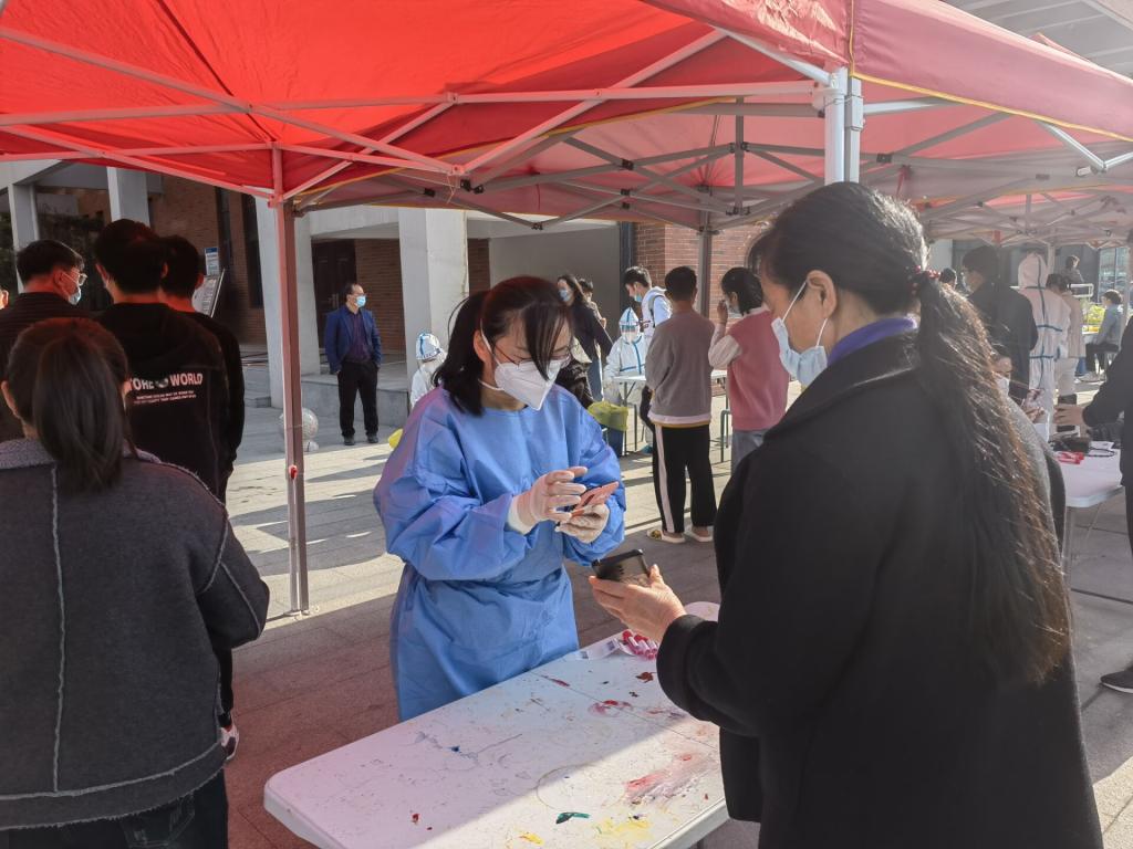 两位教师党员按照学院安排,积极投入志愿活动,扫描安康码、核酸预约登记码、身份证等完成核酸检测信息的录入,帮助医护人员完成采集工作。