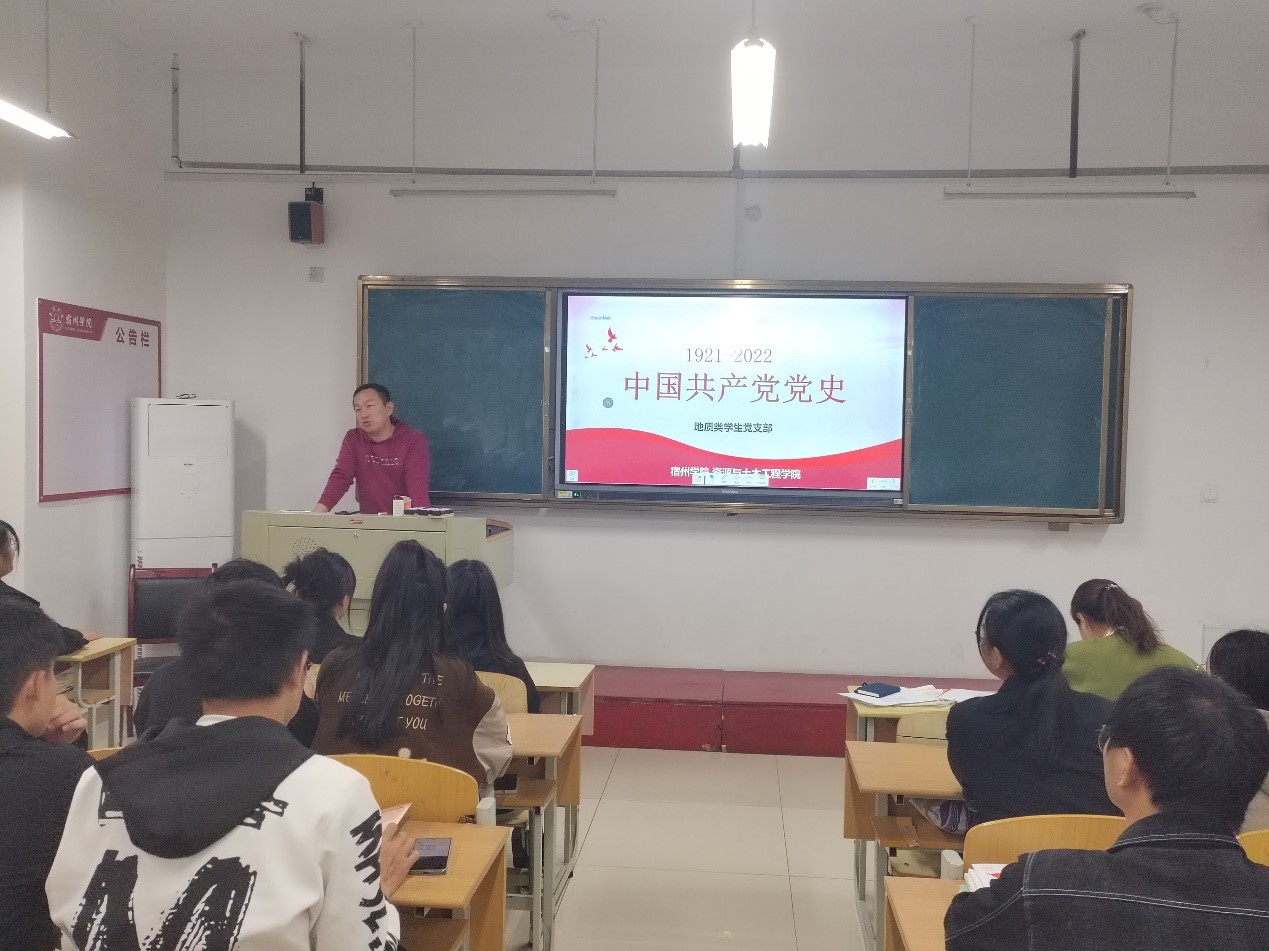 为迎接党的二十大胜利召开,进一步激励和引导新生认识了解中国共产党,摆正心态,将青春奋斗融入党和人民的事业,资源与土木工程学院地质类专业学生党支部于10月10日晚七点在实训楼A607举办党史宣传教育特色活动。党支部书记赵景宇担任主讲,22级地质专业全体学生参与了本次活动。