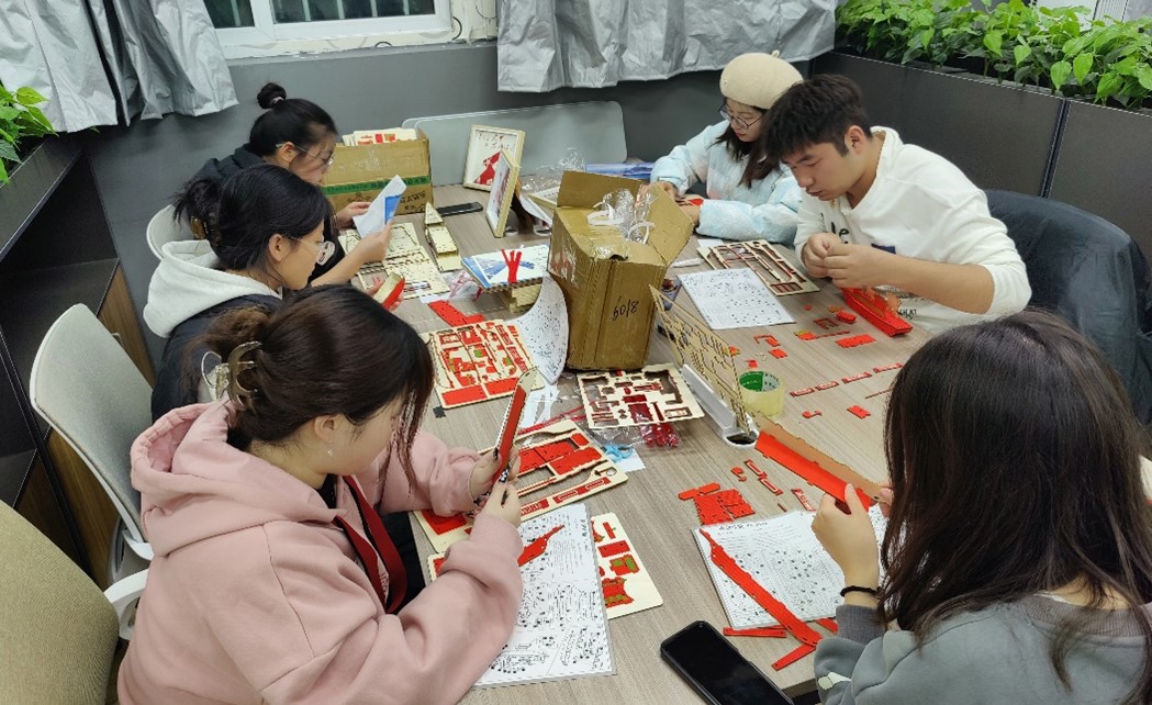 支部成员围坐在一起一边拼接模型一边讲述着关于它们的故事,回望历史为我们的党一步步由小变大、为我们的国家一步步由弱到强感到无比自豪。