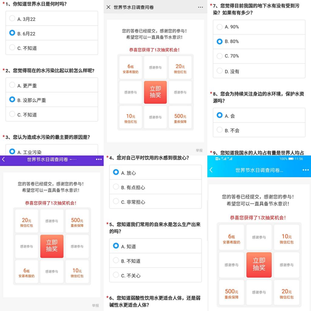 本次调查问卷活动志在号召同学们珍惜节约水资源,保护有限的生命之源。活动开始后,负责人将调查问卷的二维码发布到活动群内,期间,同学们积极认真的填写节水调查问卷,及时把调查问卷完成的截图界面发给活动负责人。同学们从问卷中认识到水与人类生活的密切关系,认识到保护现有水资源的重要性,懂得了有关保护节约用水的知识和技巧。
