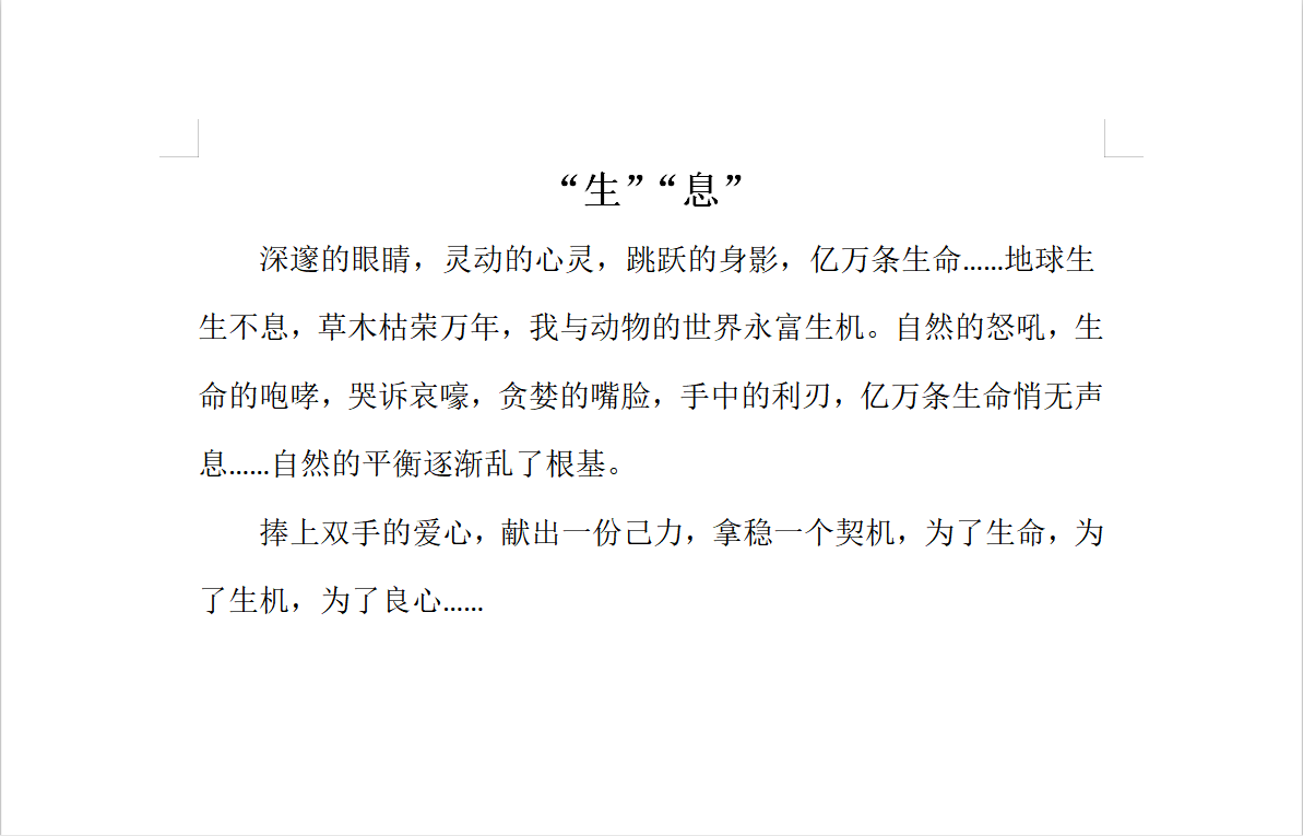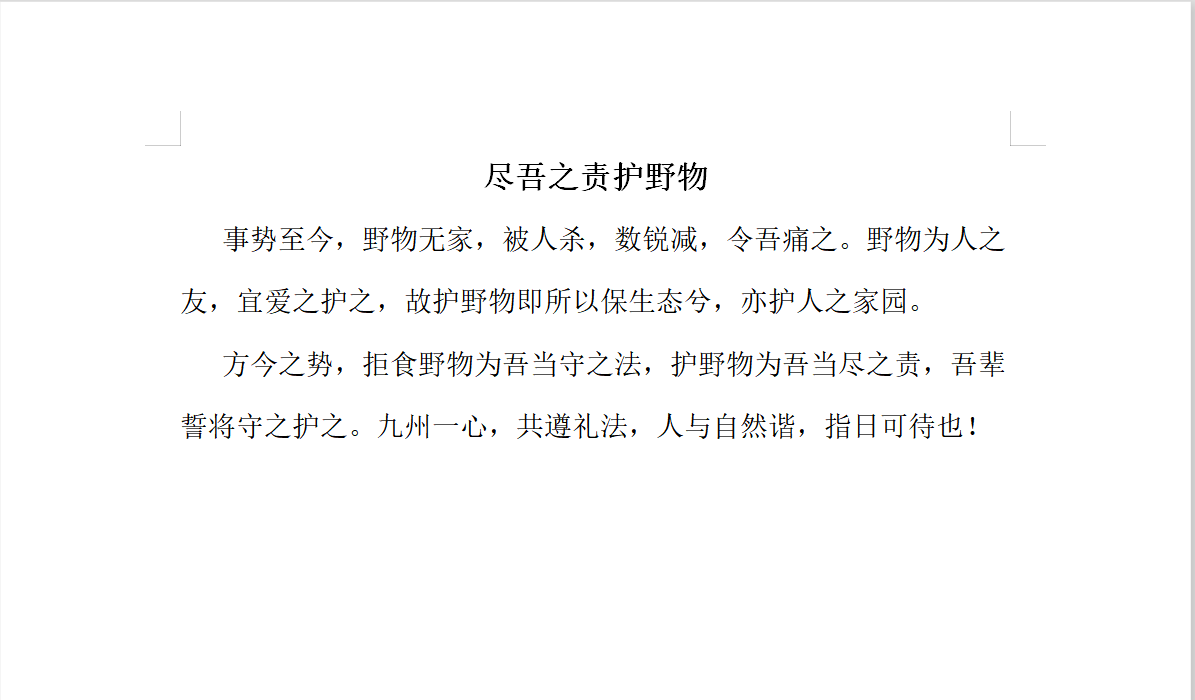 本次活动以“情系野生动物,建设生态文明”为主题,通过撰写倡议宣言的形式传播爱护环境、保护野生动物、人与自然和谐共生的理念。活动期间,同学们积极参与、踊跃报名。选手们创作出一段段行云流水的语句、发人深省的文字,作品内容或生动有趣,或沉重痛心,十分具有教育意义,展现出当代大学生爱护自然的意识,保护动植物的担当与责任。最后,评委根据倡议宣言的内容、构思以及蕴意主旨三个方面进行评选,负责人在活动群里公布获奖名单。