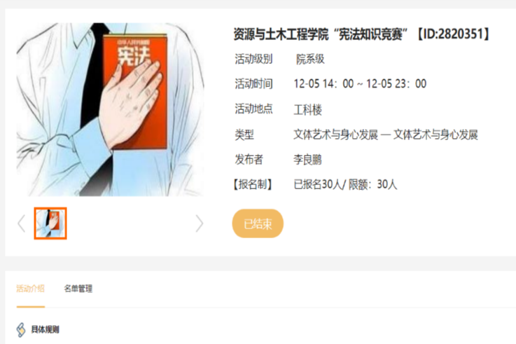 为贯彻党的十九大精神,深入学习宣传中央全面依法治国工作会议精神,资源与土木工程学院于12月5日举办了“宪法知识竞赛”活动。