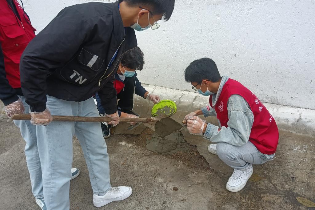 上午,志愿者们在学校北门集合共同前往泰康社区开展志愿活动。到达现场后,志愿者们身穿志愿服,带上手套,分工合作,齐力配合。热心的社区居民为志愿者们提供了水和铁锹,部分志愿者们用水泥灰和水搅拌成水泥砂浆并将其填充在地板的裂缝中,其余志愿者们则为他们撑伞遮雨。水泥逐渐用尽,原本参差不齐的地板裂缝已修复平整。为防止雨水将刚铺的水泥冲散,大家向周边的居民们借来了杂物袋,铺盖在修复好的地板上。本次志愿活动就此完工,大家在活动场地合影留念后便原路返校。
