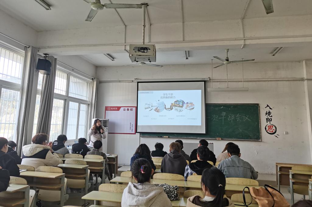 会议开始,曹静对新学期繁多复杂的工作进行了简单安排,希望各部门负责人统筹安排、提前规划,将各类活动有序的开展完成。关于本学期内发生变动的学分认证需通知到位、认真审核,各类大型活动需在明确主题的同时认真策划。其次,曹静提出学生干部要具备良好的个人素质,努力提升个人本领,在团队协作、交流沟通、创新竞争等方面争创一流。最后,曹静希望学生干部们要改变工作方法,努力提升工作效率,在完成学业目标的同时实现个人价值,度过丰富多彩的大学生活。