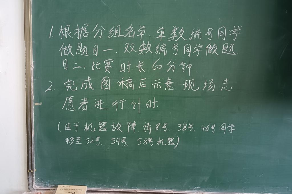 比赛开始前,各组参赛人员有序进行签到、上机,在场的工作人员也在积极配合参赛人员。选手到达指定电脑后,首先在电脑上建立了自己署名的文件夹,将比赛内容保存在此文件夹中。并将文件夹存到E盘,以免数据丢失。比赛开始,工作人员分发CAD作图纸质版成稿,供参赛人员对照作图,给出大部分标注数据,但仍任有需要自己计算的部分。参赛人员熟练的敲击键盘、轻点鼠标,图像慢慢的呈现在电脑上。在完成作品后,告知工作人员,进行用时纪录。全体参赛人员将用时记录表,在比赛结束后交给现场志愿者,然后统一交由老师打分,作为评分标准。