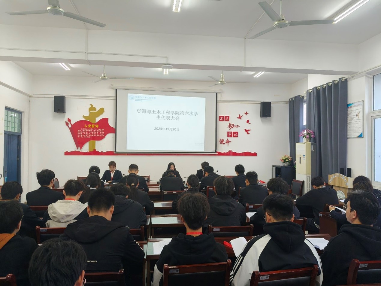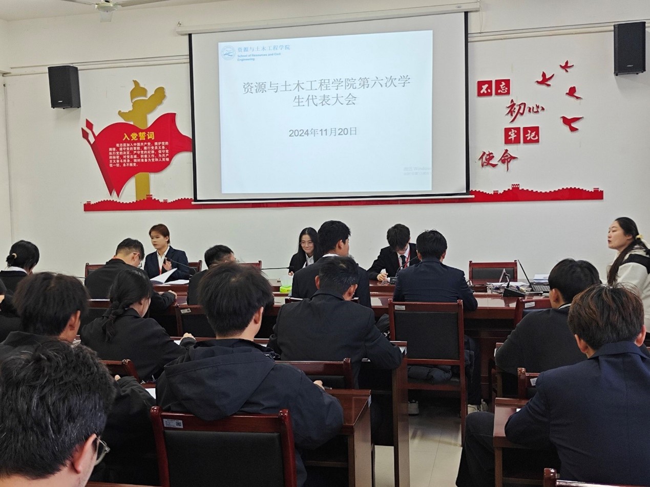 2024年11月20日,资源与土木工程学院第六次学生代表大会在工科楼A402隆重举行。本次大会聚焦学院学生的工作的发展与变革,承载着全院学生的期望与嘱托,众多师生齐聚一堂,共同见证这一重要时刻。