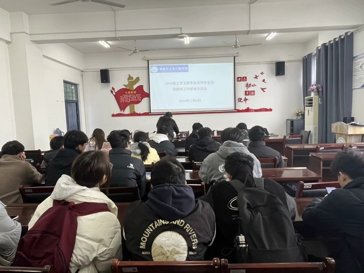2024年12月6日,2016级土木工程专业优秀毕业生黄鹏程工作经验交流会在工A402成功举行。资源与土木工程学院的学生们积极参与,现场气氛热烈。