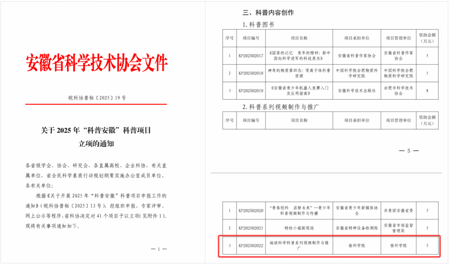 近日,安徽省科学技术协会公布了2025年“科普安徽”科普项目立项结果,资源与土木工程学院张俊博士申请的“地球科学科普系列视频制作与推广”项目获批立项,这标志着我院在科学普及与创新教育领域取得重要突破。