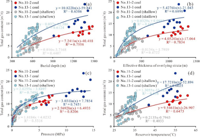 Fig. 10. Correlation between total gas content and burial depth (a), effective thickness of overlying strata (b), gas pressure (c) and reservoir temperature (d) of deep CBM reservoirs from the Panji Deep Area.