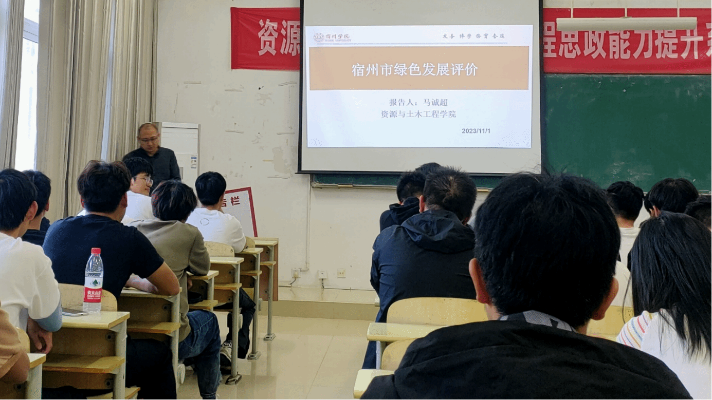 2023年11月1日下午3:00,马诚超老师在工A106做了题为《宿州市绿色发展评价》的学术讲座,一百余名土木工程专业学生参加讲座。