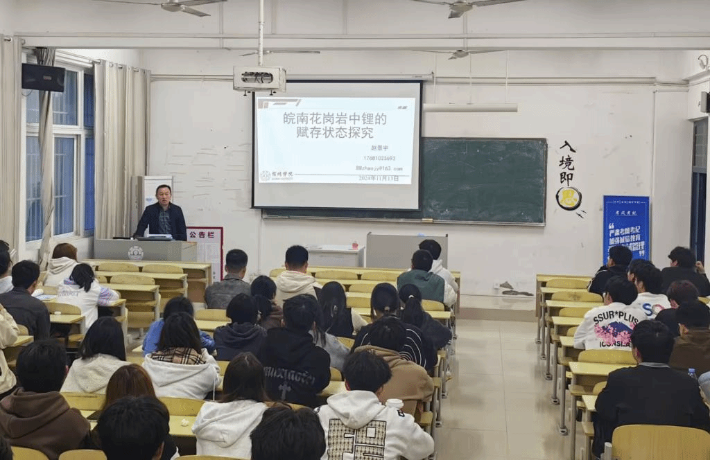 2024年11月13日下午,刘从民博士和赵景宇博士在工科楼A106分别做题为《微生物矿化固化Pb污染土的工程性质及微观作用机理》、《皖南花岗岩中锂的赋存状态探究》的讲座,土木工程、地质工程及水文与水资源工程等专业部分学生参加了讲座。