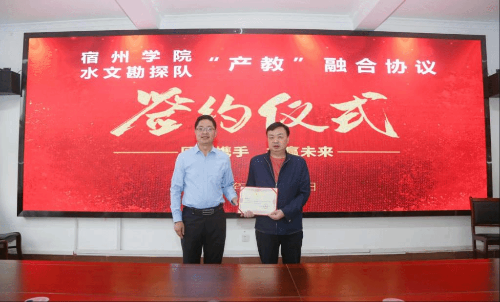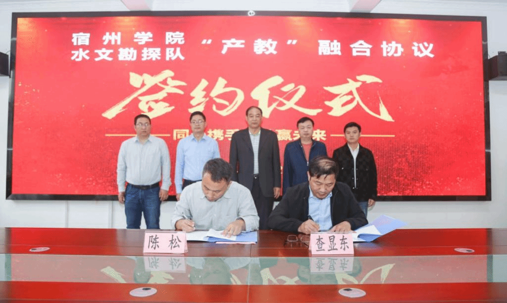 双方分别介绍了地质学科与省水文勘探队的发展情况。陈松与查显东签订《宿州学院 安徽省煤田地质局水文勘探队“产教”融合协议》,张持堂向省水文勘探队现场指导教师发聘书,桂和荣与秦福刚为双方“产教”融合实践教学基地揭牌。双方还就如何落实产教融合、人才培养、科研成果转化等进行了座谈交流。