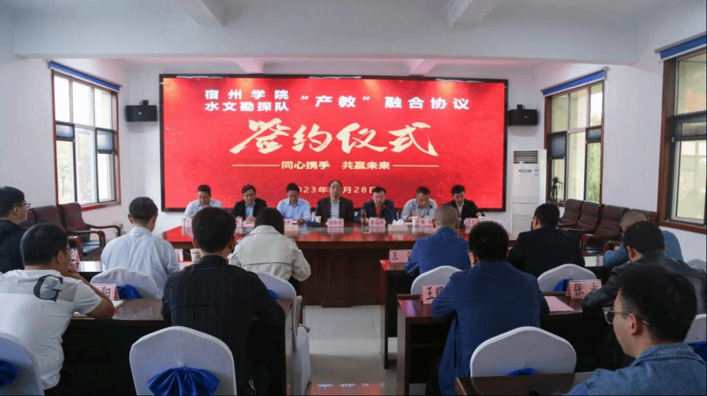 10月28日,我院与安徽省煤田地质局水文勘探队(以下简称省水文勘探队)“产教”融合协议签约仪式在省水文勘探队行政楼会议室举行。省水文勘探队党委书记、队长秦福刚,党委委员、副队长、总工程师查显东,党委委员、副队长汪志祥等省水文勘探队相关负责人员,宿州学院学术委员会主任桂和荣、资源与土木工程学院党委书记张持堂、院长陈松和学院相关负责人员出席签约仪式。