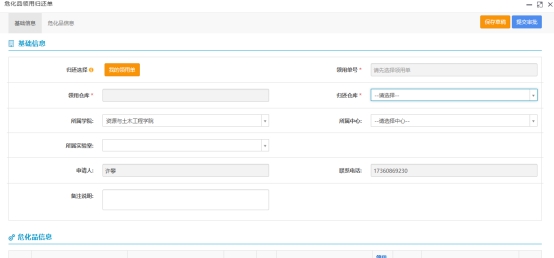 点击我的领用单,系统会显示之前借出物资,按内容填写完整后提交审批即可归还借出物资,如使用完毕请将使用完的试剂瓶带到中心实验室。